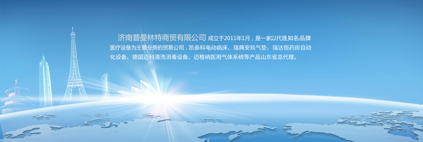 濟南普曼林特商貿有限公司成立于2011年1月,是一家以代理知名品牌醫療設備為主要業務的貿易公司,還是凱泰科公司系列產品(凱泰科醫用轉移車、凱泰科電動起立床、凱泰科電動病床)、瑞典安玖公司系列產品(安玖電動病床、安玖多功能體位輔助設備、安玖醫用防褥瘡氣墊、安玖移位升降機、安玖主動充氣壓力系統、安玖轉運車)、北京瑞達恒藥房自動化設備、德國邁科清洗消毒設備、邁格納醫用氣體系統等產品山東省的總代理。